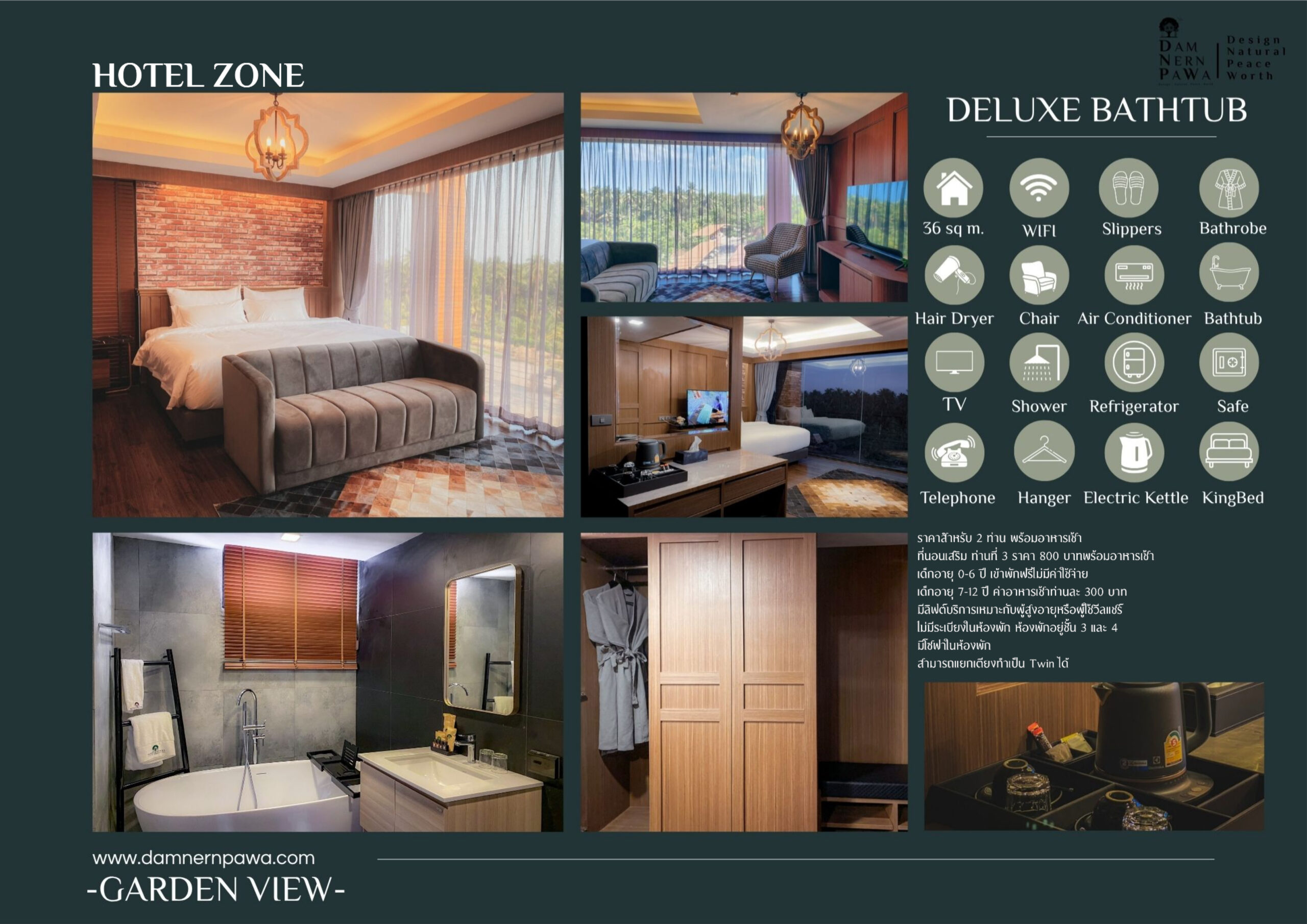 ดำเนินพวา รีสอร์ทบ้านต้นไม้ DELUXE BATHTUB KING A spacious 36-square-meter room featuring a comfortable king-size bed offers an elevated relaxation experience surrounded by nature and tranquility. The room also includes a private bathtub and a full range of modern amenities.